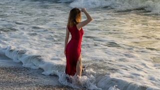 Woman in Red Dress Standing on Beach